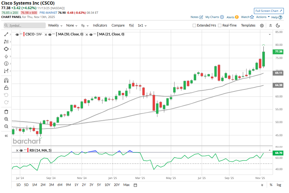 Cisco (CSCO) has surged to a new 20-year high, briefly touching $79.50 on Nov. 13 after posting quarterly results that once again topped Wall Street’s expectations. Shares closed more than 4.6% higher as CSCO’s management raised full-year revenue and earnings outlook. Investor confidence has been further supported by the company’s steady expansion in recurring business, a key indicator of long-term stability.