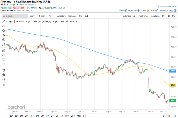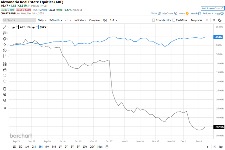 On Oct. 27, Alexandria Real Estate reported its third-quarter results for 2025. The company’s total revenues decreased 5% year-over-year (YOY) to $751.94 million, falling short of Wall Street analysts’ estimate of $756.20 million. Its adjusted funds from operations (FFO) declined 6.3% from the prior-year period to $2.22 per share, missing the $2.31 per share estimate from analysts. Based on subdued results, the REIT’s stock dropped 19.2% intraday on Oct. 28. Recently, Alexandria Real Estate also announced a 45% reduction in its Q4 dividend compared to Q3, as an effort to preserve liquidity. This led to the stock dropping 10.1% intraday on Dec. 3.