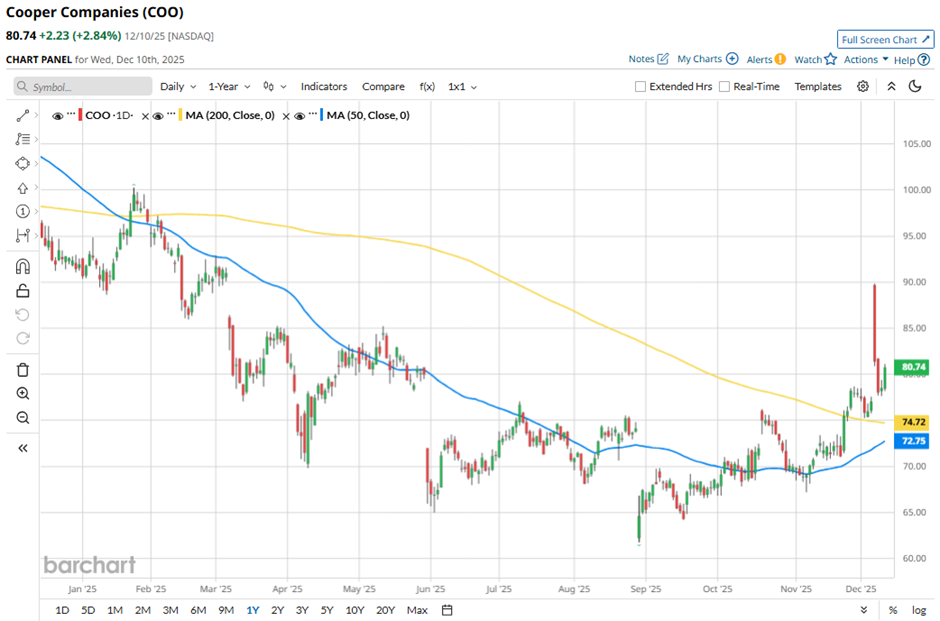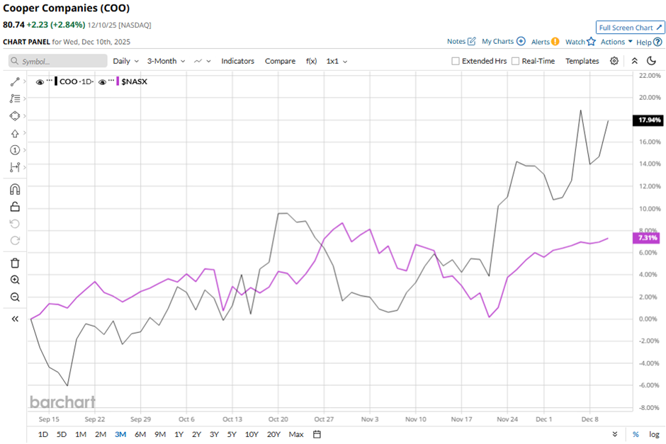 Shares of the San Ramon, California-based company have declined 19.6% from its 52-week high of $100.47. COO stock has soared 19.3% over the past three months, outperforming the Nasdaq Composite’s ($NASX) 8.1% increase over the same time frame.
