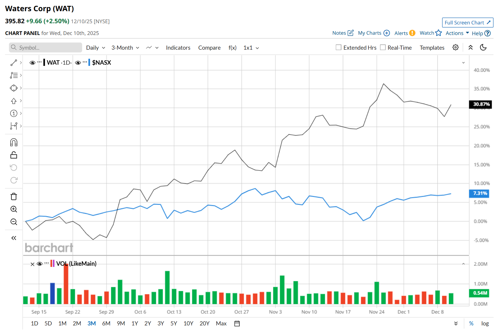 On Nov. 4, shares of WAT surged 6.3% after the company delivered strong Q3 results, which handily exceeded analyst estimates. Primarily due to solid growth in its pharmaceutical segment, the company’s net sales improved 8% year-over-year to $800 million, surpassing consensus estimates by 2.6%. Moreover, its adjusted EPS climbed 16% from the same period last year to $3.40, topping analyst expectations of $3.21. Additionally, WAT raised its fiscal 2025 sales and adjusted EPS guidance, further bolstering investor confidence.
