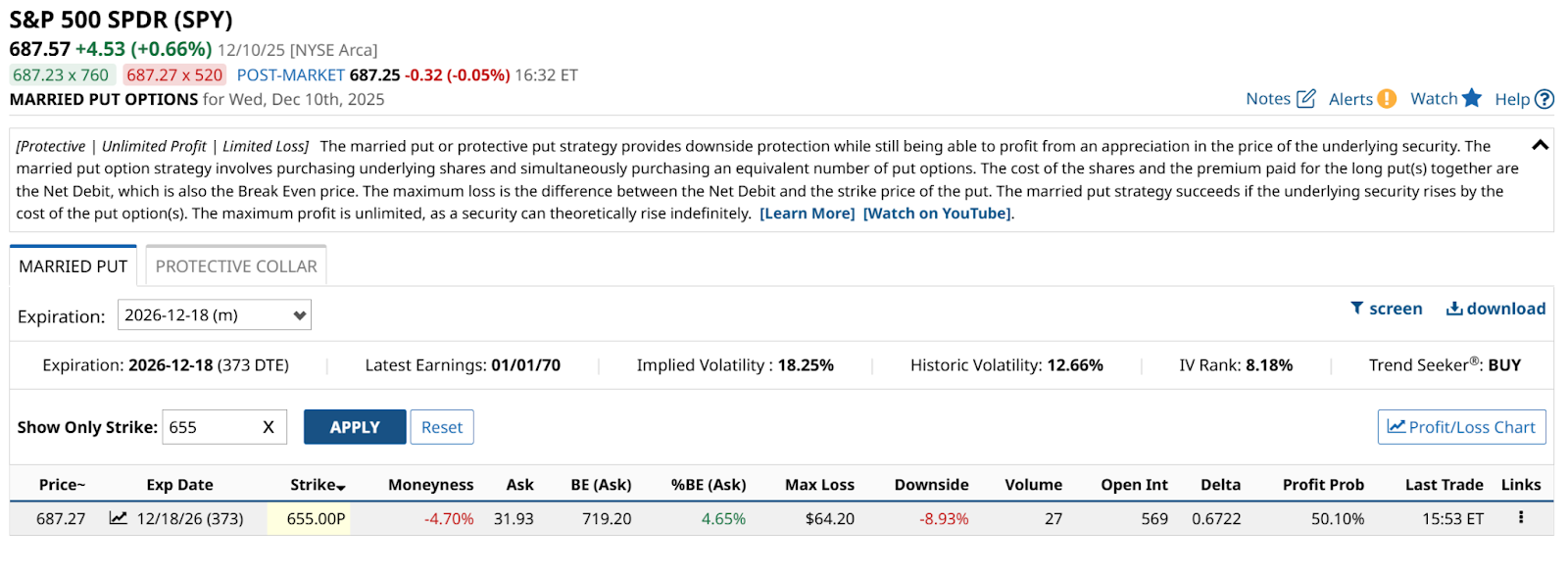 As we see above, a $655 put out to Dec. 18, 2026 is about 4.7% out of the money. Add to that the cost of the put, which is about $32 a share, and it nets to about a 9% downside risk.