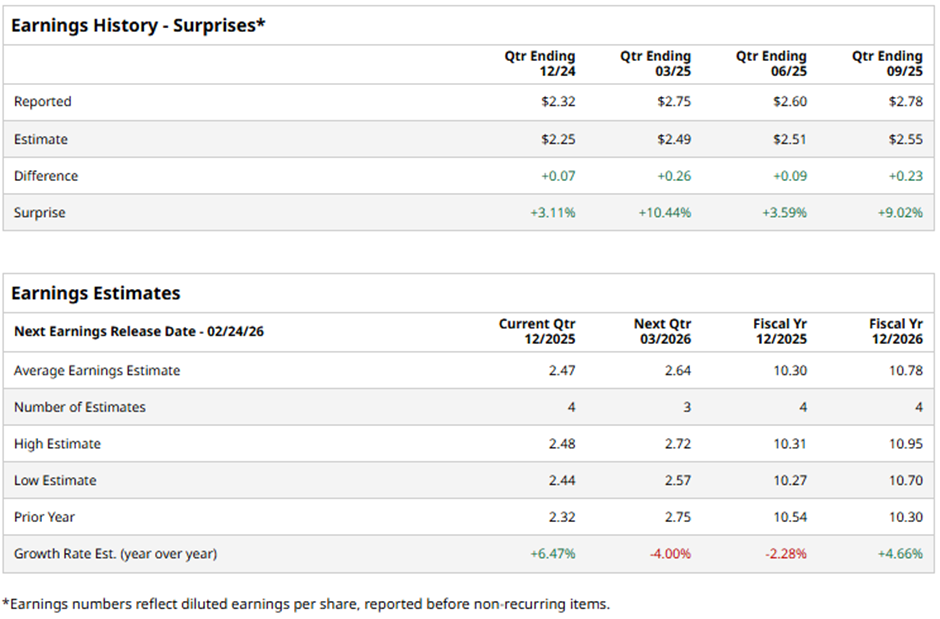 The Boston, Massachusetts-based company is expected to release its fiscal Q4 2025 results soon. Ahead of this event, analysts project AMT to report an AFFO of $2.47 per share, a 6.5% rise from $2.32 per share in the year-ago quarter. It holds a solid track record of consistently surpassing Wall Street's bottom-line estimates in the last four quarterly reports.