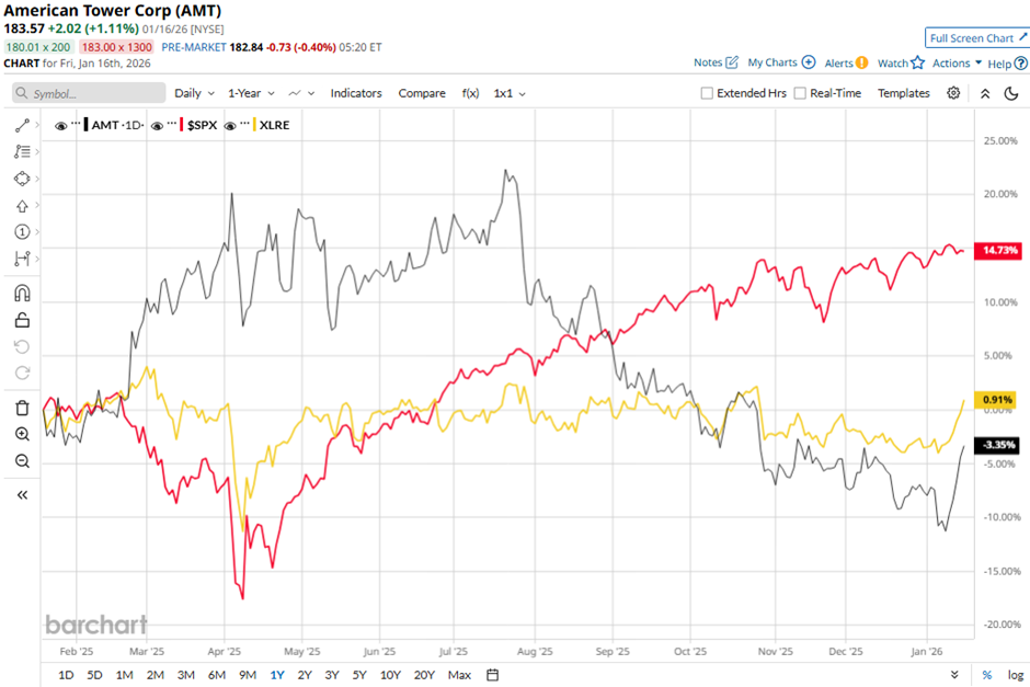 Shares of American Tower have declined 3.4% over the past 52 weeks, underperforming the broader S&P 500 Index's ($SPX16.9% gain and the State Street Real Estate Select Sector SPDR ETF's (XLRE2.7% rise over the same time frame.