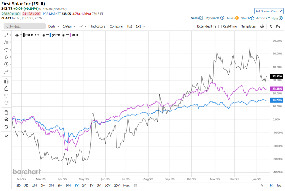 Shares of First Solar have risen 27.7% over the past 52 weeks, outperforming the broader S&P 500 Index's ($SPX) 16.9% gain and the State Street Technology Select Sector SPDR ETF's (XLK) 26.4% return over the same period.