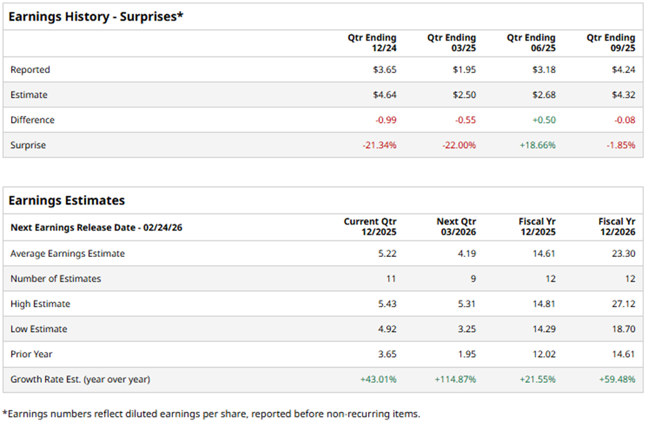 The Tempe, Arizona-based company is slated to announce its fiscal Q4 2025 results soon. Ahead of this event, analysts expect FSLR to report a profit of $5.22 per share, a 43% surge from $3.65 per share in the year-ago quarter. It has exceeded Wall Street's earnings expectations in one of the past four quarters while missing on three other occasions.
