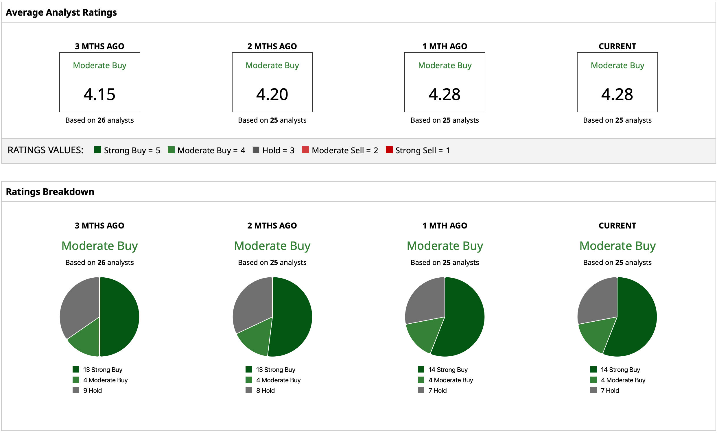 Overall, analysts have deemed C stock as a “Moderate Buy,” with a mean target price of $131.46, which denotes an upside potential of about 14% from current levels. Out of 25 analysts covering the stock, 14 have a “Strong Buy” rating, four have a “Moderate Buy” rating, and seven have a “Hold” rating.
