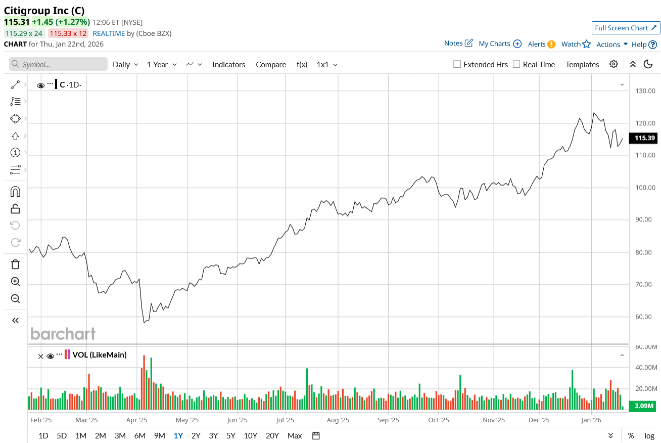 Additionally, with a market cap of $201.83 billion, C stock is up 41% over the past year, offering a dividend yield of 2.03%. This is higher than the sector median of 1.30%.