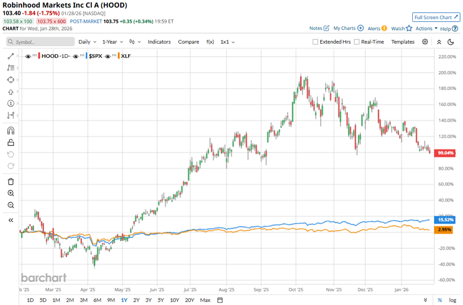 Shares of the Menlo Park, California-based company have significantly outpaced the broader market over the past 52 weeks. HOOD stock has surged 109.3% over this time frame, while the broader S&P 500 Index ($SPXhas returned 15%. However, shares of the company are down 8.6% on a YTD basis, lagging behind SPX’s 1.9% gain.
