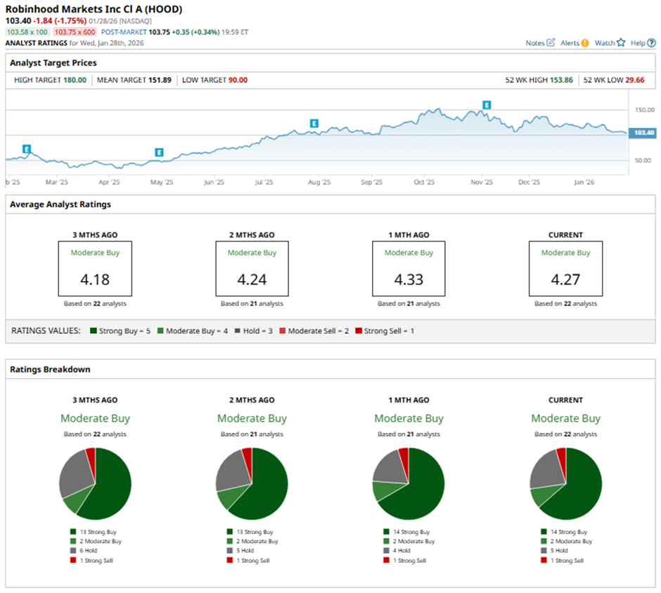 The mean price target of $151.89 represents a 46.9% premium to HOOD’s current price levels. The Street-high price target of $180 suggests a 74.1% potential upside.
