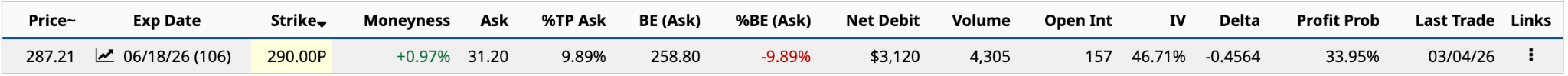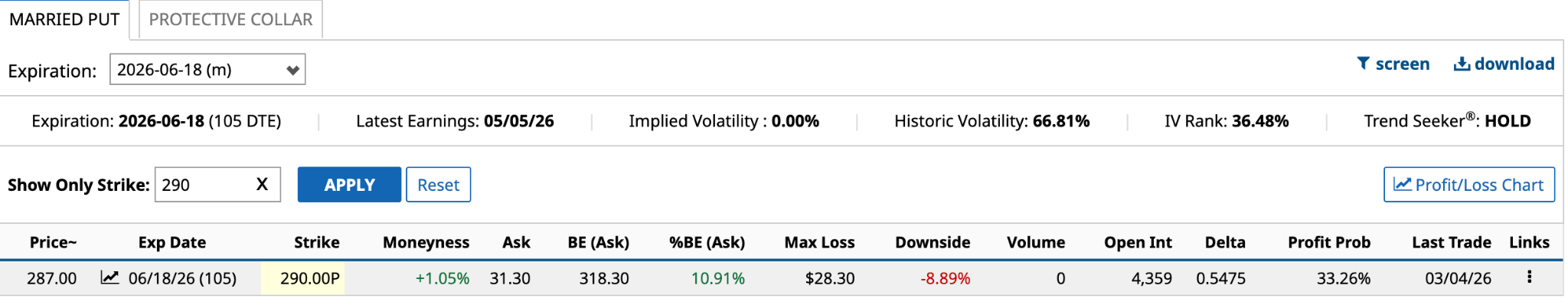 The net debit or cost of the $290 married put is $318.30 [$287 share price + $31.30 ask price].