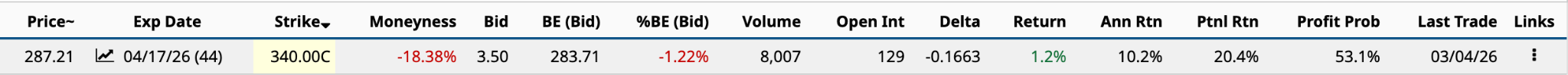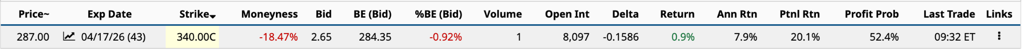 The premium for selling the $340 call is $2.65, an annualized return of 7.9% [$2.65 [bid price premium / $287 share price - $2.65 bid price premium * 365 / 43 DTE].