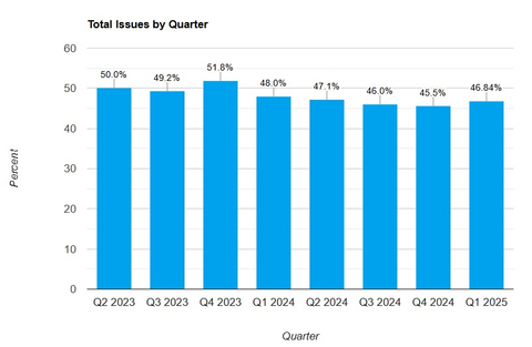 During Q1 2025 46.8% percent of transactions on a ~$80bn portfolio comprising of residential, commercial and business purpose loans had issues leading to a risk of wire & title fraud. On average, problematic loans had 2.5 issues per loan which is a new record, indicating the lack of appropriate controls by closing agents and lenders to identify and fix issues.