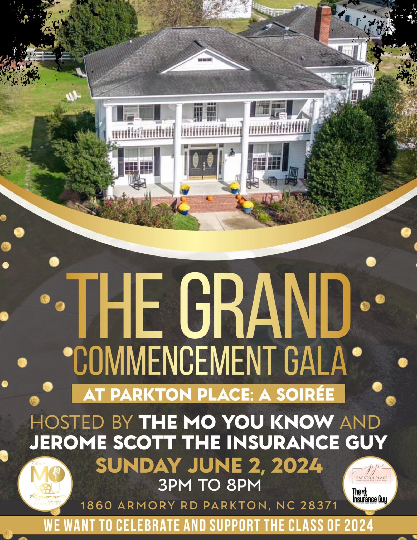 Parkton, NC - Get ready for an evening of elegance and celebration as Parkton Place hosts the Grand Commencement Gala, honoring the Class of 2024. Presented by The Mo You Know and Jerome Scott The Insurance Guy, this soirée promises to be an unforgettable event that brings together the community to recognize the achievements of graduating students.