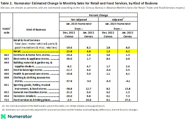 Numerator, a data and technology company providing insights into consumer behavior, has released its monthly Numerator Retail Sales Report, an advance projection of the US Census Bureau’s monthly retail and food services sales report. For this month, Numerator is reporting its headline retail sales number excluding food services & drinking places because of unusually mild weather that likely contributed to stronger than normal sales for food services & drinking places (up 9.1% on a seasonally adjusted basis compared with December 2022 and up 27.5% compared with January 2022). Both Numerator and the US Census Bureau adjust for seasonal variation and holiday and trading-day differences, but not for price changes.