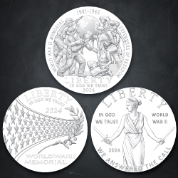 “The Greatest Generation commemorative coin designs are emblematic of the National World War II Memorial and the service and sacrifice of American soldiers and civilians during World War II,” said United States Mint Director Ventris C. Gibson.  “We hope this program will honor their unwavering courage and selfless spirit.”